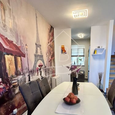 The two-story apartment consists of a living room with kitchen, dining room, loggia, storage room and bathroom on the lower floor on the first floor, while the second floor is located in a high attic with two rooms, a wardrobe, an anteroom and a wonderful balcony with an open view of the entire Kvarner. The area of the apartment is 70.10m2, while together with the garage it is 84.85m2.